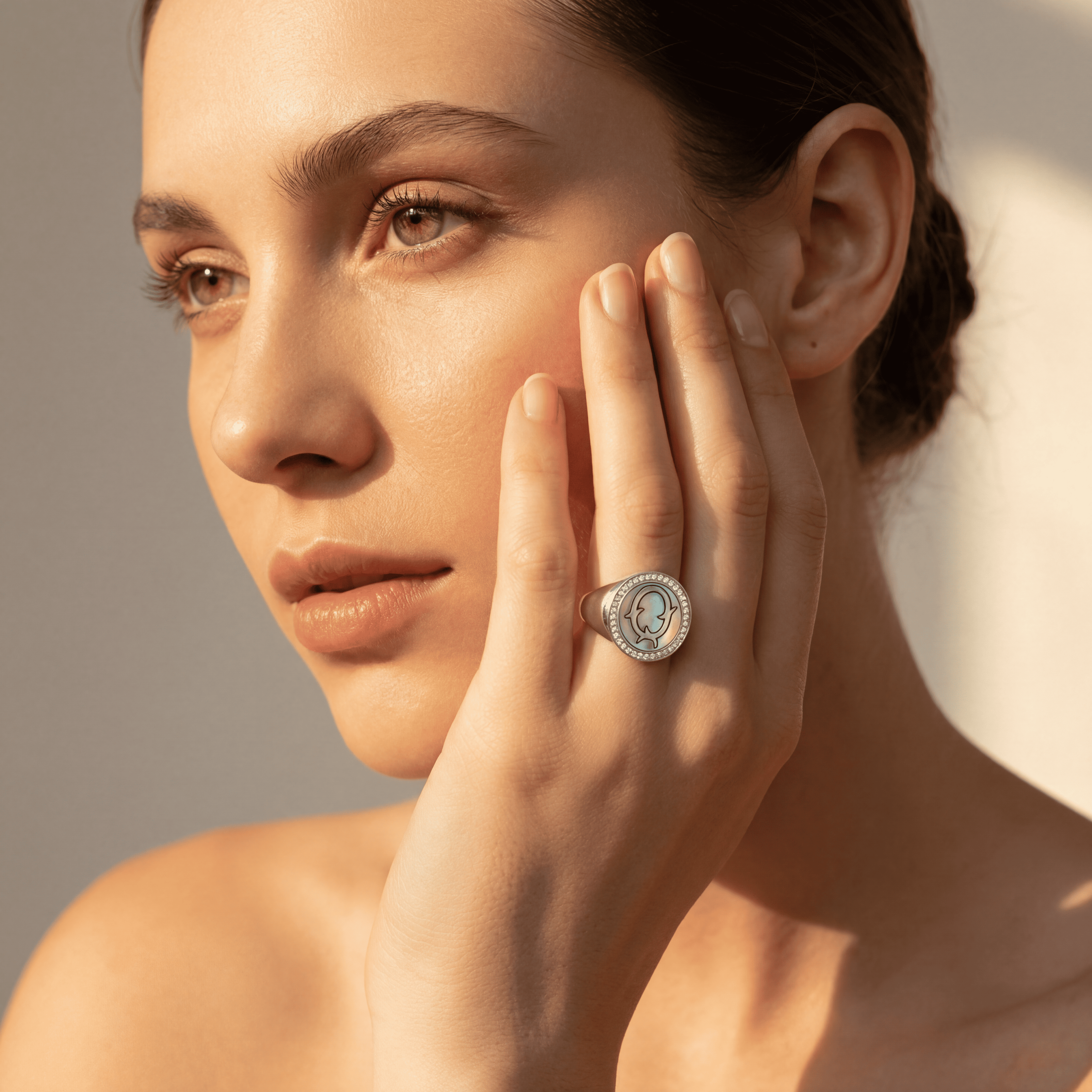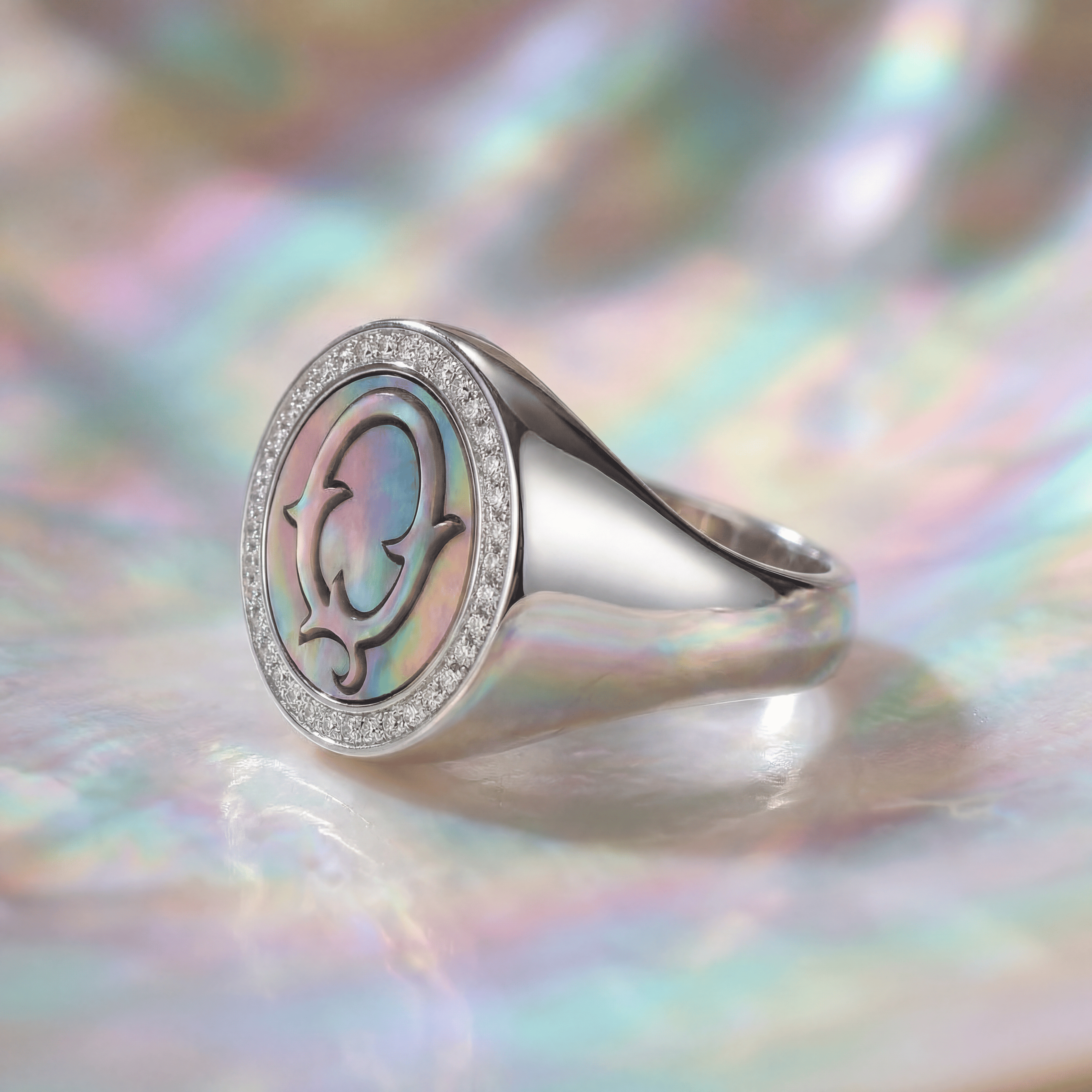 Vintage Fire-Engraved Initial Mother of Pearl Diamond Jewelry Rings
