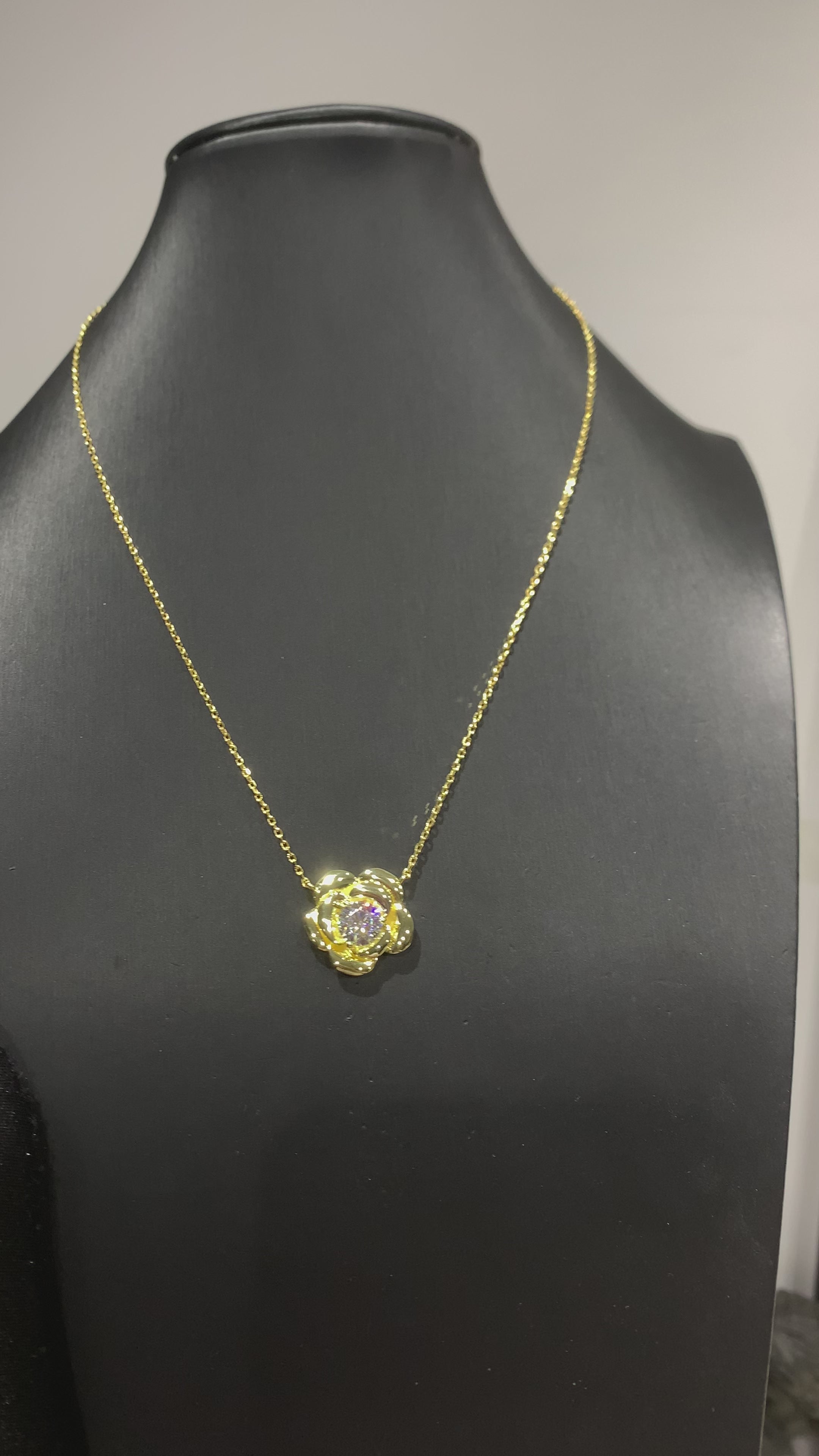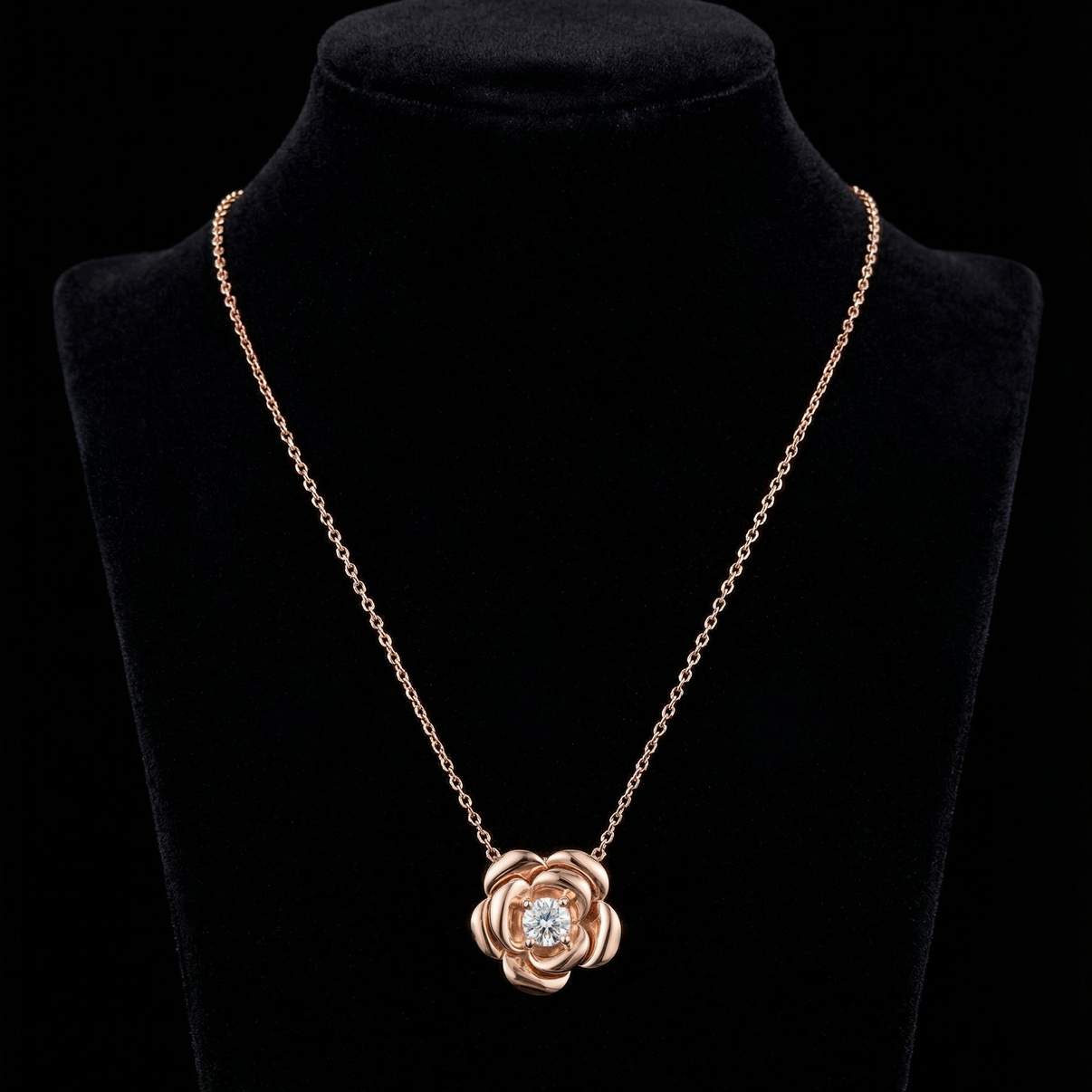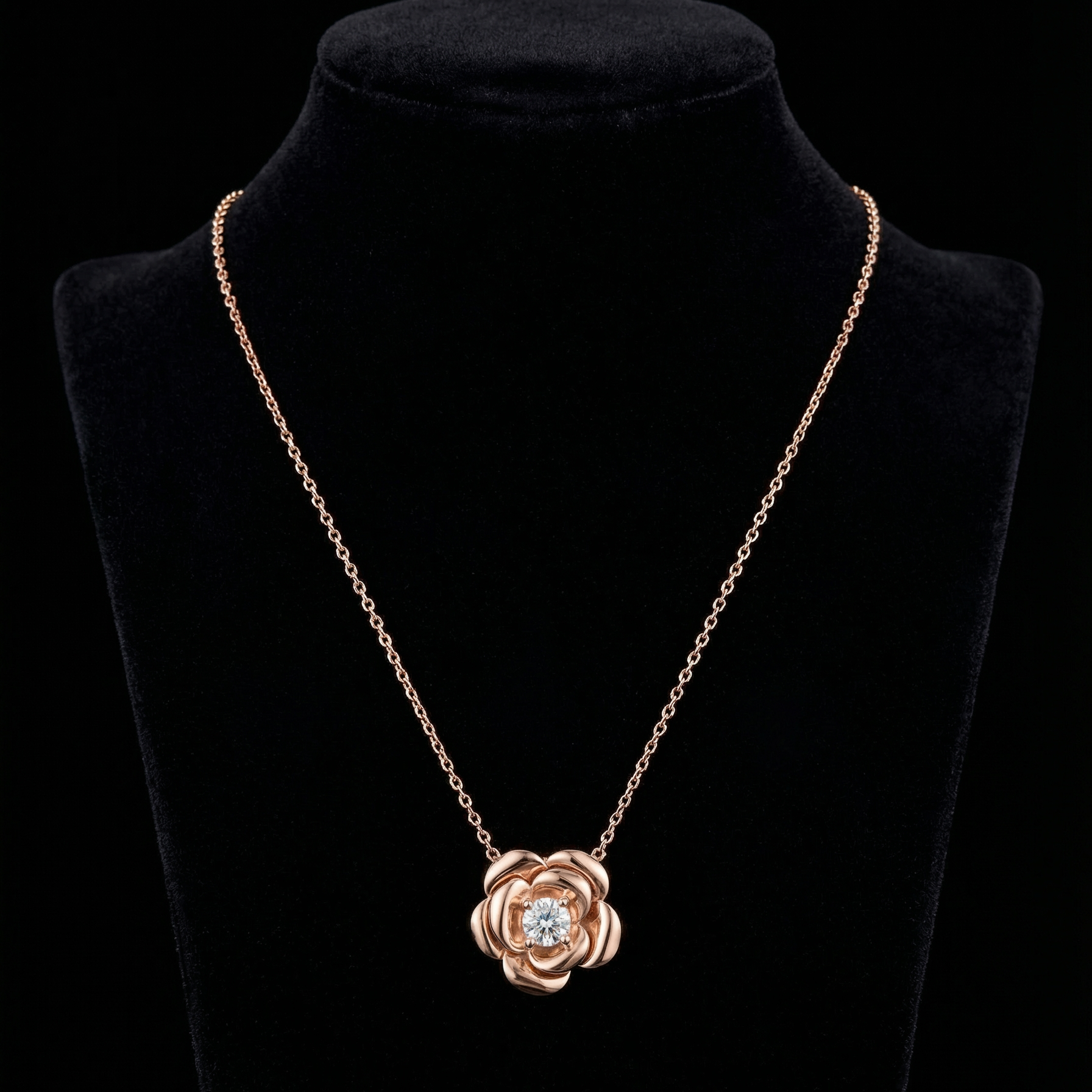 This flower-shaped pendant is crafted in a warm rose-tone finish, centered with a brilliant stone that catches light effortlessly. Clean lines and smooth curves create a balanced look — elegant, modern, and easy to wear every day.