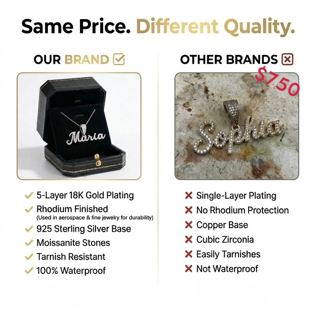 Colgante personalizado con nombre en plata 925 con acabado esmaltado en elegante cursiva. Piedras VVS. Oro de 10 a 18 quilates y diamantes opcionales. ¡Brillo personalizado!