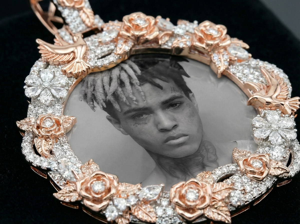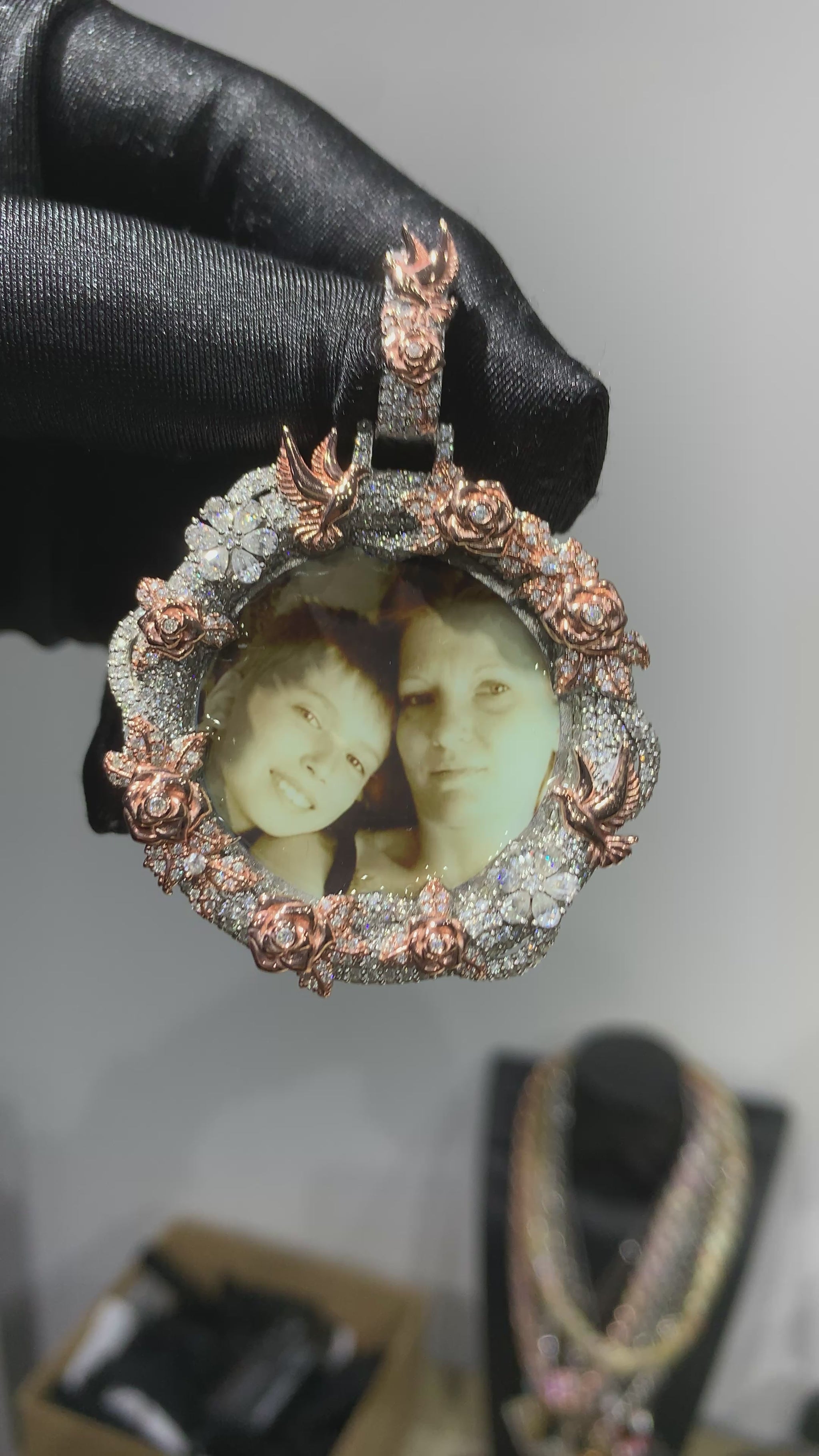 This custom memorial photo pendant is designed to honor the ones you carry in your heart. Framed with hand-set stones, sculpted roses, and angel wings, every detail represents love, protection, and remembrance.